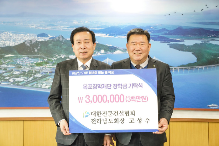[전남=프레스뉴스] 이광남 기자= 대한전문건설협회 전라남도회(회장 고성수)가 지난 10일 재단법인 목포장학재단(이사장 박홍률 목포시장)에 장학기금 3백만원을 기탁했다.