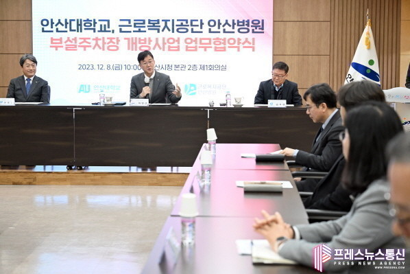 | ▲ 지난 8일 시청 제1회의실에서 열린 안산시-안산대학교-근로복지공단 안산병원, 부설주차장 개방사업 업무협약식 모습(사진=안산시) |