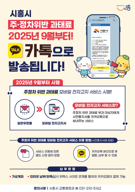 [프레스뉴스] 장현준 기자= 시흥시(시장 임병택)는 오는 9월부터 ‘주정차 위반 과태료’ 고지서를 전자문서(카카오톡)로 발송하는 ‘모바일 전자고지 서비스’를 정식으로 운영한다.