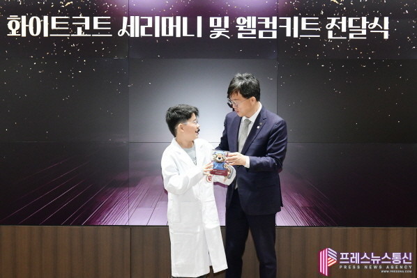 | ▲이민근 안산시장(오른쪽)이 지난 15일 화이트가운을 입은 한 신입생에게 웰컴키트를 전달하고 있다.(사진=안산시) |