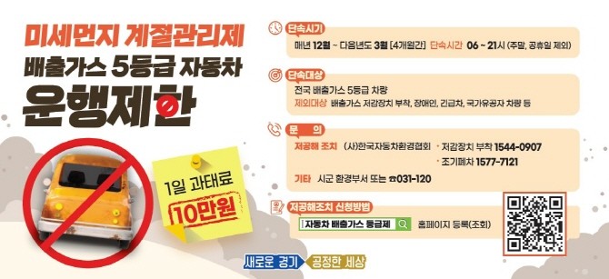 | ▲ 미세먼지 계절관리제 배출가스 5등급 자동자 운행제한 이미지(사진=경기도) |