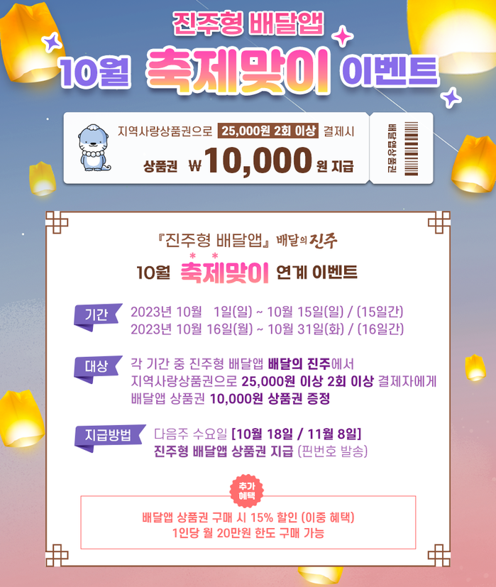 각 기간 지역사랑상품권으로 2만 5000원 이상을 2회 이상 결제한 소비자에게 진주형 배달앱 전용 상품권 1만 원을 캐시백으로 증정하는 이벤트이다.