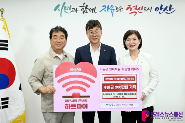 [프레스뉴스] 장현준 기자= 안산시(시장 이민근)는 지난 20일 민주평화통일자문회의 안산시협의회 여성분과위원회(위원장 조춘자)로부터 호우피해 복구와 아동복지 지원을 위한 성금 200만 원을 기탁받았다고 21일 밝혔다.