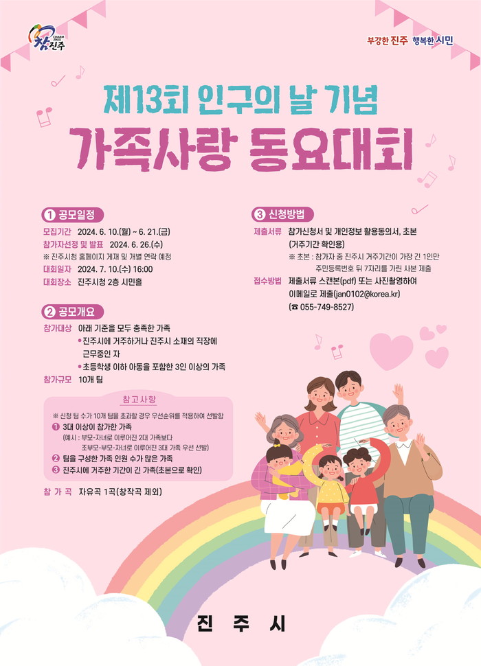 [프레스뉴스] 정호일 기자= 진주시는 7월 10일 오후 4시 시청 2층 시민홀에서 ‘제13회 인구의 날 기념행사’에 『가족사랑 동요대회』를 개최한다.