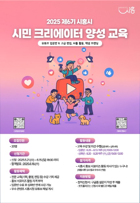 [프레스뉴스] 장현준 기자= 시흥시(시장 임병택)는 다양한 영상 기획물을 통해 시정 소식을 시민에게 더욱 쉽고 재미있게 전달하기 위해 ‘2025 제6기 시민 크리에이터 양성 교육’ 참가자 20명을 5월 21일부터 6월 16일까지 모집한다.