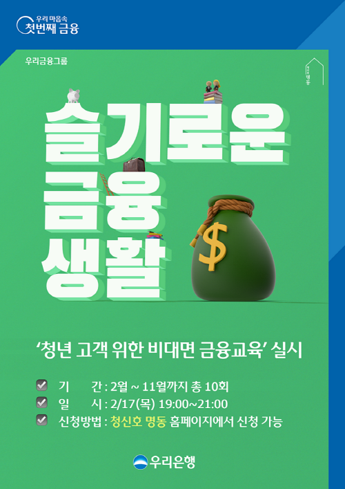 [프레스뉴스] 김대일 기자= 우리금융지주의 자회사 우리은행(은행장 권광석)은 SH서울주택도시공사의 청년·신혼부부 주거 브랜드 홍보관인‘청신호 명동’에서 대학생, 사회초년생, 신혼부부를 위한 금융교육 프로그램 ‘슬기로운 금융생활’을 17일부터 비대면으로 실시한다고 10일 밝혔다.