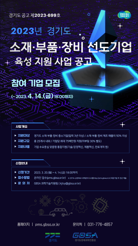 ▲경기도 소재·부품·장비 선도기업 육성 지원사업 공고 포스터(사진=경기도경제과학진흥원) |