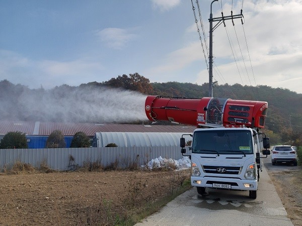 | ▲ 제천시가 23일 야생멧돼지 폐사체 발견 인근 지역에서 ASF 확산방지를 위한 방역활동을 하고 있다.사진=제천시 |