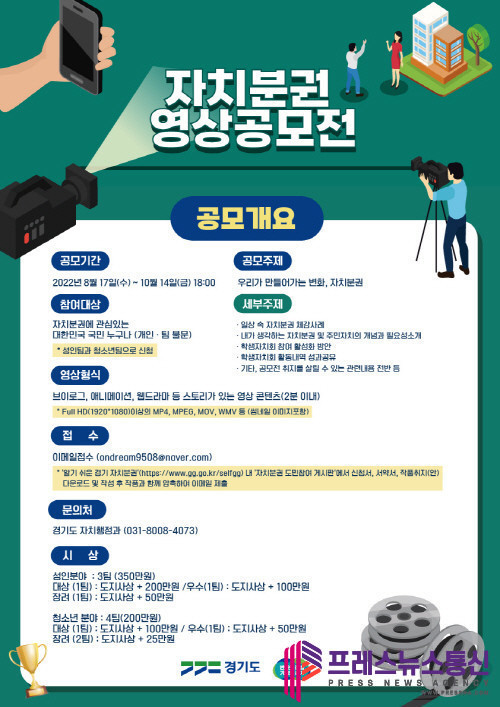 [프레스뉴스] 장현준 기자= 경기도가 자치분권 인식확산과 참여 활성화를 위해 10월 14일까지 ‘2022년 경기도 자치분권 영상공모전’을 개최한다고 18일 밝혔다.