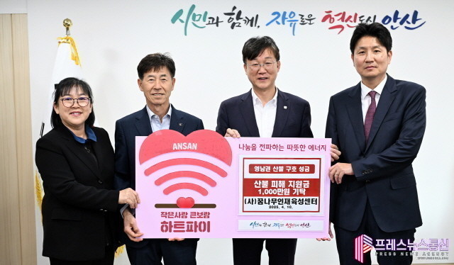 [프레스뉴스] 장현준 기자= 안산시(시장 이민근)는 지난 10일 (사)꿈나무인재육성센터(이사장 전구표)로부터 영남지역 산불 피해 지원 후원금 1,000만 원을 기탁받았다고 11일 밝혔다.