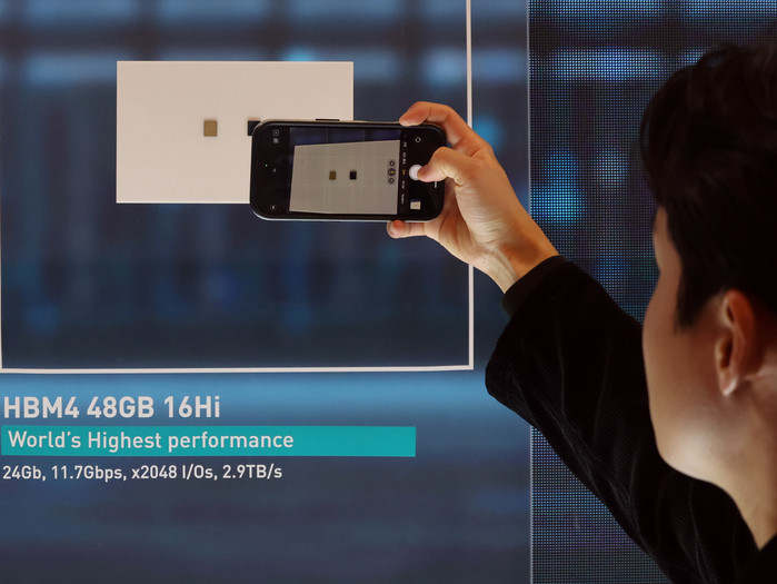 | ▲세계 최대 IT(정보기술)·가전 전시회 'CES 2026' 개막 사흘차인 8일(현지시간) 미국 네바다주 라스베이거스 베네치안호텔에 마련된 SK하이닉스 전시관에서 '프레스투어' 참석자가 'HBM4 48G 16Hi'를 촬영하고 있다./사진-뉴스1 |