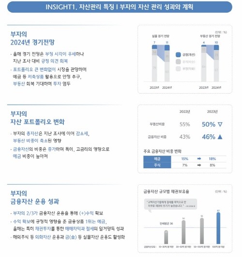 2024년 실물 경기와 부동산 경기를 긍정적으로 전망하는 부자의 비율이 높아지며 경기 회복을 기대하는 분위기였다. 하지만 낙관적으로 반전되지는 못하고 관망세로 돌아서며 자산 포트폴리오를 적극적으로 조정하기보다 그대로 유지하겠다는 부자가 지난 조사 10명 중 5명에서 이번에는 7명으로 늘었다.