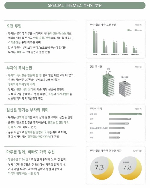 부자에게 독서는 일상인 동시에 휴식이었다. 부자들은 1년에 약 10여 권의 책을 읽었다. 특히, 금융자산 100억 원 이상의 슈퍼리치는 그보다 두 배 많은 20여 권을 읽는 것으로 나타났다. 부자는 지적 욕구 충족을 위한 인문사회 분야의 독서를 가장 선호한 반면 일반 대중은 부자의 60% 수준으로 책을 읽으며 소설과 자기계발서를 선호해 부자와 차이를 보였다.