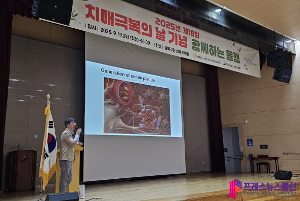 ▲지난 19일 상록구청 시민홀에서 열린 ‘제18회 치매극복의 날’ 기념행사에서 '치매는 치료가 가능한가?'를 주제로 강좌를 진행하고 있다.(사진=안산시) |