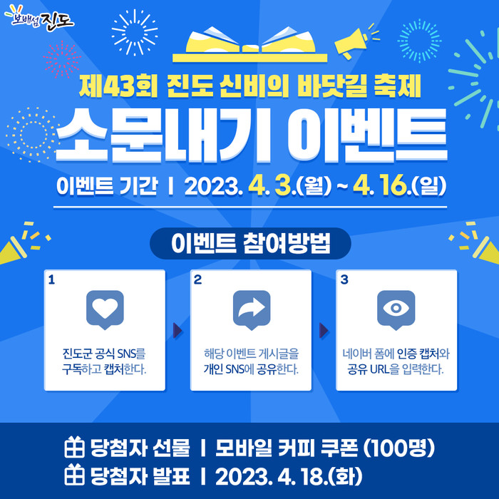 참여자 중 100명을 무작위로 추첨해 모바일 커피 쿠폰을 제공한다. 당첨자 발표는 오는 18일 진도군 공식 SNS에서 실시하며, 경품은 개별 발송한다.
