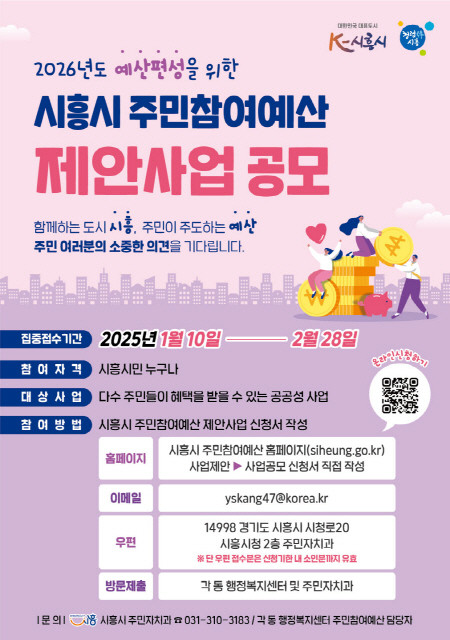 2월 말까지 접수된 제안 사업은 일반 제안사업과 자치계획형 사업으로 구분돼, 각각 주민참여예산위원회와 동별 주민자치회에서 심사, 현장 확인, 주민투표 등을 거쳐 최종 선정된다. 선정된 주민참여예산사업은 2026년도 시흥시 예산안에 반영된다.