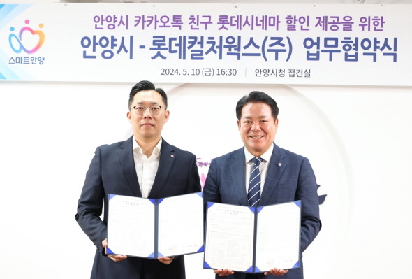 | ▲지난 10일 최대호 안양시장(오른쪽)과 김무성 롯데시네마 운영부문장(왼쪽)이 참석한 가운데 롯데컬처웍스와 업무협약식을 열었다.(사진=안양시) |