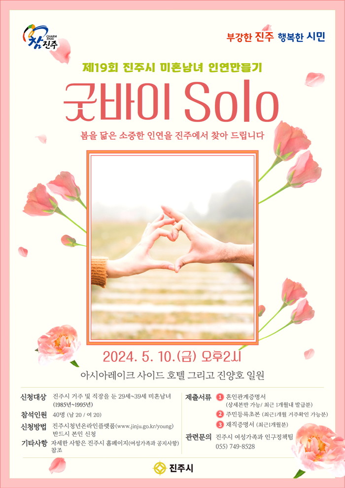 진주에 주소를 두고 있거나 진주 소재 직장을 둔 1985~1995년생 미혼남녀는 누구나 신청 가능하며, 진주시 청년 온라인플랫폼 (www.jinju.go.kr/young)에서 구비서류를 첨부하여 8일부터 21일까지 신청하면 된다.