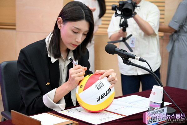 ▲배구 여제 김연경이 지난 29일 'MBC 배구예능 성공기원 안산시 도시브랜드 제고 파트너십 강화' 자리에서 기념구에 사인을 하고 있다.(사진=안산시) |