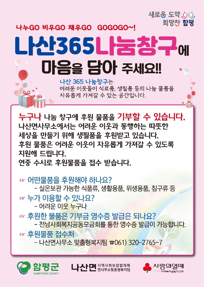 정화자 나산면장은 “수혜자와 공급자가 따로 없는 나눔창구는 이웃과 이웃을 잇는 지역 공동체 연결고리 그 자체”라며 “기부 또는 지원을 희망하는 주민들은 언제든지 문을 두드려 주길 바란다”고 말했다.