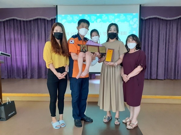 | ▲ 단양유치원 강보민 원아 가족이 단양 소방 경연대회에서 최우수상을 차지했다.사진=단양유치원 |