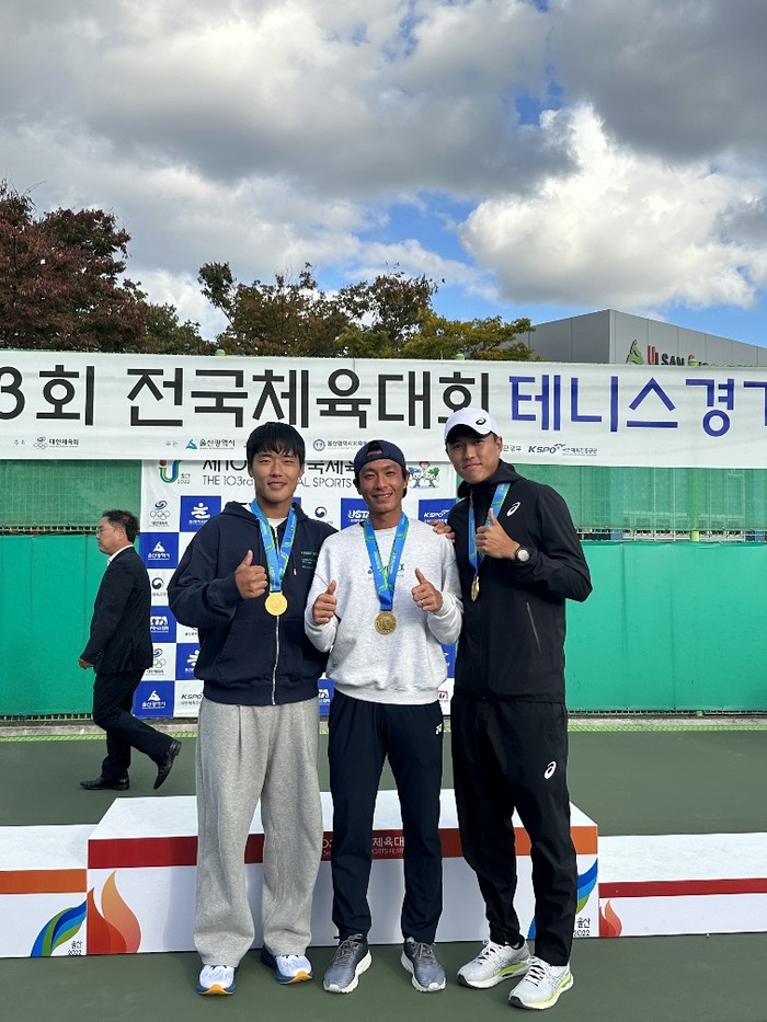 ▲ 제103호 전국체육대회에서 세종시청 테니스팀이 남자단체전에서 우승을 했다. 왼쪽부터 신산희, 홍선찬, 남지성 선수(사진=세종시) |