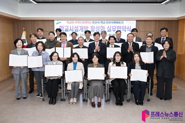 | ▲이민근 안산시장(둘째 줄 오른쪽 다섯번째)이 2026년 3월 17일 안산시청에서 2026년 상반기 학교시설개방 활성화 실무협약식을 진행하고 기념촬영을 하고 있다.(사진=안산시) |