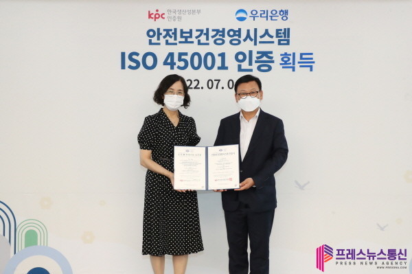 [프레스뉴스] 김대일 기자= 우리은행(은행장 이원덕)은 한국생산성본부인증원으로부터 안전보건경영시스템 국제표준규격인 ‘ISO45001’ 인증을 은행권 최초로 획득했다고 6일 밝혔다.