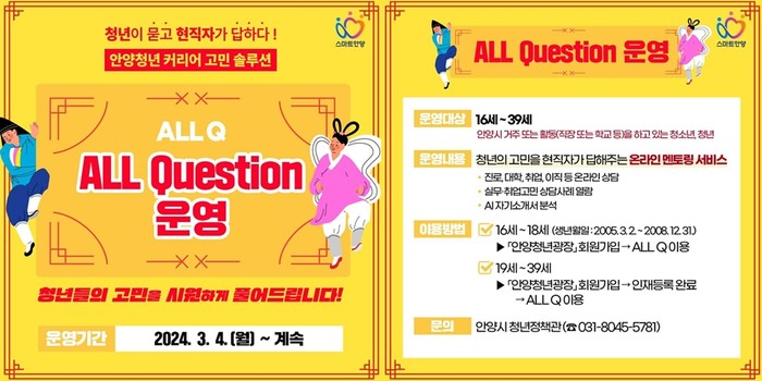 [프레스뉴스] 장현준 기자= 안양시는 청년들의 진로, 대학, 경력 등 다양한 고민을 해결하는 데 도움을 주는 온라인 플랫폼 ‘올큐(ALL Question)’를 구축하고 4일 서비스를 시작한다.