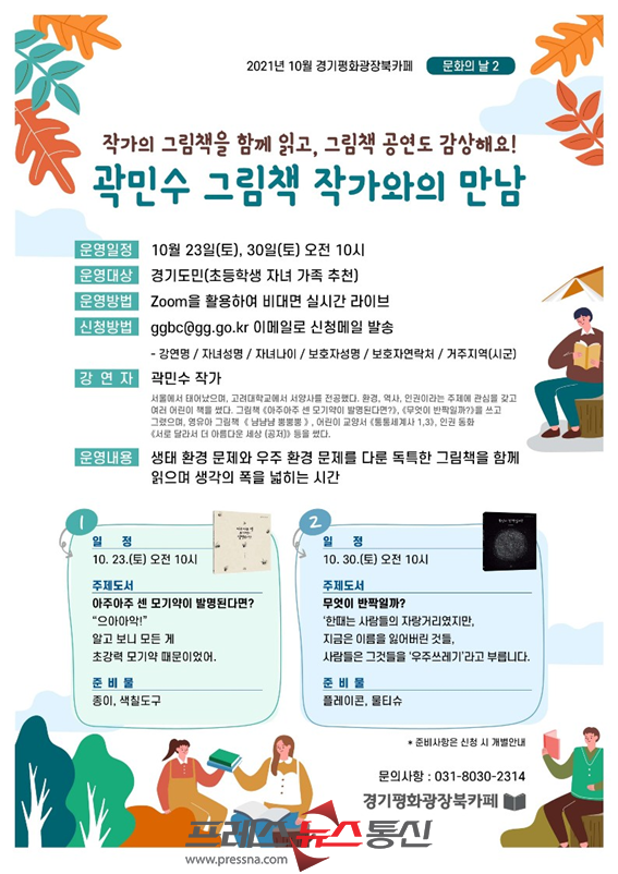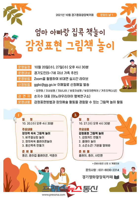 [프레스뉴스] 김대일 기자= 경기도는 경기평화광장 북카페의 10월 문화의 날 행사로 ‘감정표현 그림책 놀이’, ‘그림책 작가와의 만남’을 온라인으로 진행한다고 15일 밝혔다.