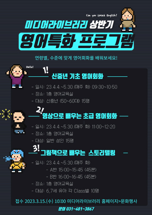 [프레스뉴스] 장현준 기자= 안산시(시장 이민근) 미디어라이브러리는 성인 및 유아를 대상으로 연령별, 수준별 맞춤형 영어 회화 프로그램을 운영한다고 13일 밝혔다.