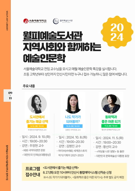 ‘지역사회와 함께하는 예술인문학’ 프로그램은 서울예술대학교 전임교수를 초빙해 진행된다. 9월 10일에는 한국음악전공 주정현 교수의 ‘도서관에서 즐기는 해금 산책이 진행되고, 10월 8일에는 극작전공 김명진 교수의 ‘나도 작가가 되어볼까?’ 프로그램이 열린다. 11월 5일에는 문예창작전공 황선미 교수의 ‘동화책과 좋은 어른 되기’ 특강이 진행된다.