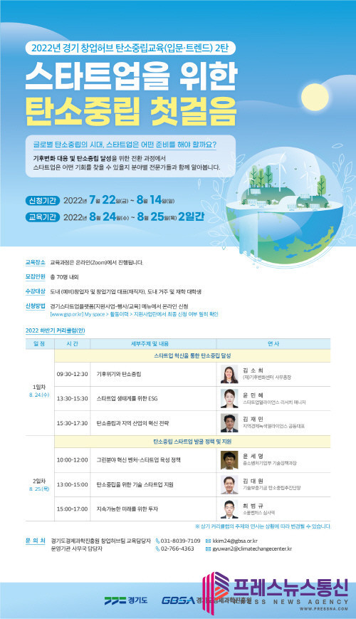 [프레스뉴스] 김대일 기자= 경기도와 경기도경제과학진흥원은 탄소중립 시대에 대응하려는 도내 스타트업을 위해 2022년 하반기 경기창업허브 탄소중립교육(입문·트렌드) ‘스타트업을 위한 탄소중립 첫걸음’을 추진한다고 22일 밝혔다.