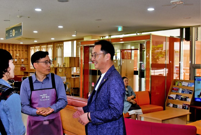 | ▲봉사자와 이야기를 나누고 있는 이기범 의원(사진제공=담양군) |