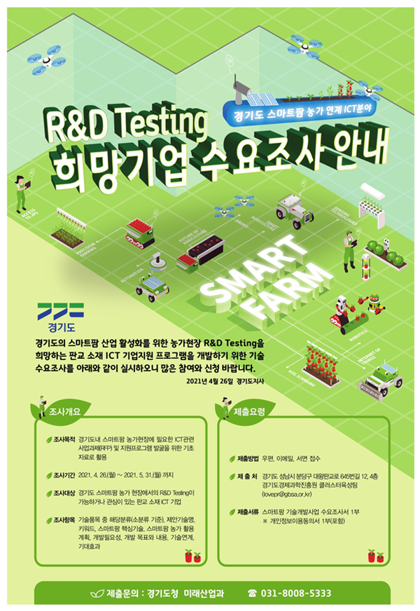 스마트팜 관련 기술을 보유하고 있거나 관심이 있는 판교 소재 ICT 기업이 조사 참여 대상이며, 조사는 오는 4월 26일부터 5월 31일까지 진행된다.