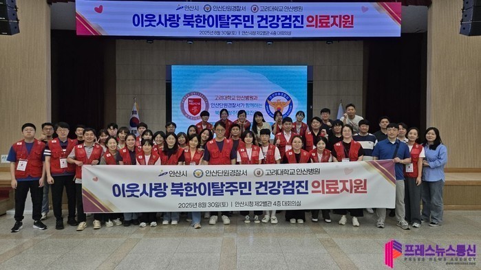 [프레스뉴스] 장현준 기자= 안산시(시장 이민근)는 지난달 30일 안산시청 대회의실에서 안산단원경찰서·고려대학교 안산병원과 함께 ‘북한이탈주민 이웃사랑 건강검진 의료봉사’를 진행했다고 1일 밝혔다.