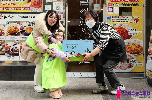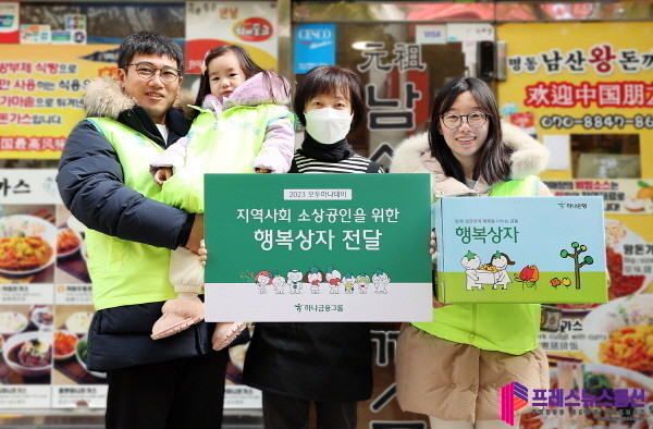 | ▲ 봉사활동에 참여한 하나금융그룹 임직원 가족이 명동 지역 소상공인에게 직접 제작한 '행복상자'를 전달하고 있다.(사진=하나금융그룹) |