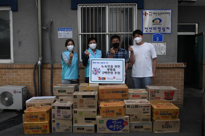 최근 지속되는 폭염 속에 어려움을 겪고 있는 거리 노숙인들을 위해 노숙인 자립지원시설인 천안희망쉼터에 컵라면, 간편식 등 200만 원 상당의 생필품을 후원했다. 전달된 물품은 천안희망쉼터를 통해 거리 노숙인 및 시설 입소자 등에게 전달될 예정이다.