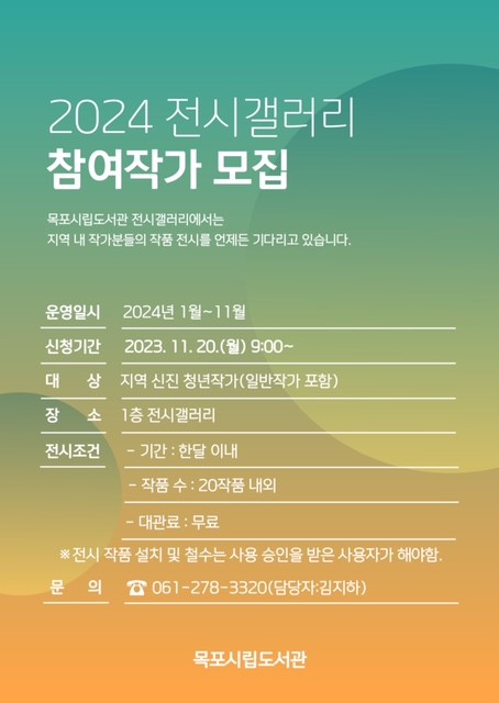 [전남=프레스뉴스] 이광남 기자= 목포시립도서관이 2024년 목포시립도서관 전시갤러리 운영을 위해 작가들에게 참여신청 받는다.