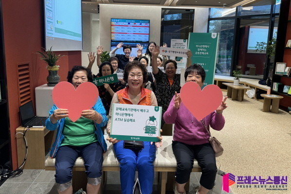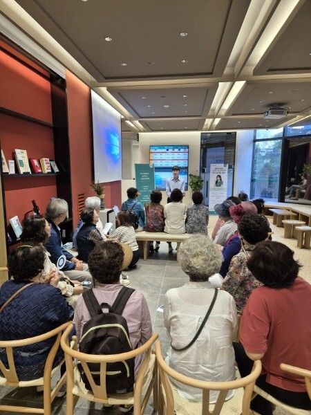 | ▲디지털문해교육을 신청한 문촌9복지관 한글교실 학습자들이 하나은행 탄현역 출장소에 방문하여 금융교육을 받고 있다.(사진=하나은행) |