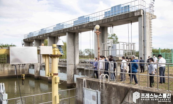 | ▲안산시의회 본오뜰 침수피해 등 재발방지 대책 마련을 위한 특별위원회가 지난 23일 구성 이후 처음으로 현장활동을 실시했다. 사진은 특위 위원들이 이날 반월천 제수문을 방문한 모습.(사진=안산시의회) |