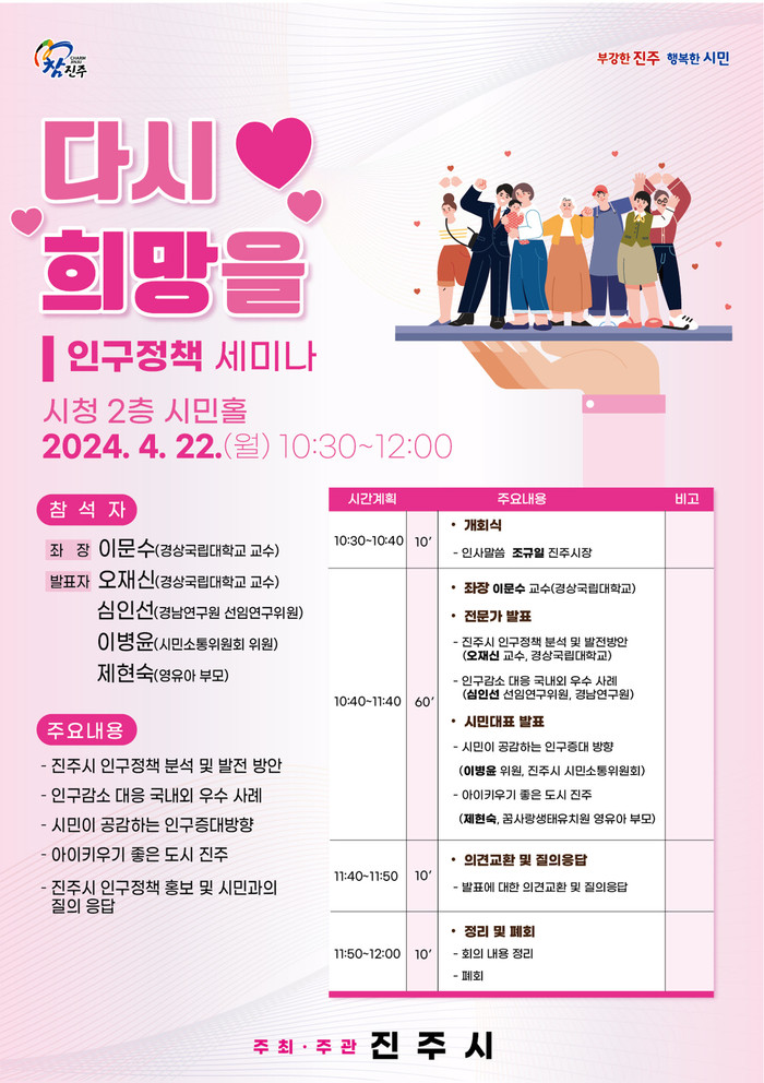 이번 세미나를 통해 지금까지 추진하고 있는 인구정책에 대해 평가해 보고, 진주시의 앞으로 나아갈 바에 대해 의견을 나눠, 인구 관련 부정적인 데이터가 쏟아지는 지금 우리에게 다시 희망이라는 긍정적 메시지를 전달하고자 한다.