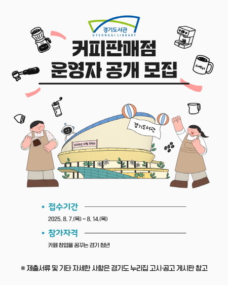 [프레스뉴스] 장현준 기자= 경기도가 오는 10월 개관을 앞둔 경기도서관 내 커피 판매점의 운영자를 모집한다. 대상은 카페 창업을 꿈꾸는 경기 청년이며, 신청 기간은 8월 7일부터 14일까지다.