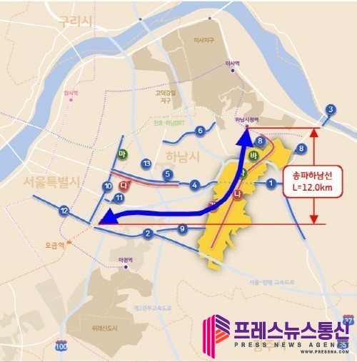 송파하남선은 서울 도시철도 3호선 오금역을 기점으로 하남시 감일지구와 교산지구를 지나 5호선 하남시청역까지 연결하는 총연장 12.0㎞, 총사업비 1조 5천401억 원 규모의 사업이다.