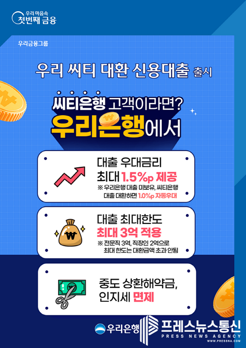 ‘우리 씨티 대환 신용대출’은 씨티은행에서 사용하고 있는 신용대출을 대환하기 위한 전용 신상품으로, 최대 1.5%P 우대금리를 제공해 최저 연 3% 초반 수준으로 대출 이용이 가능하다. 특히 우리은행 대출을 미보유한 고객이 대환을 신청할 경우 1%P가 우대된다.
