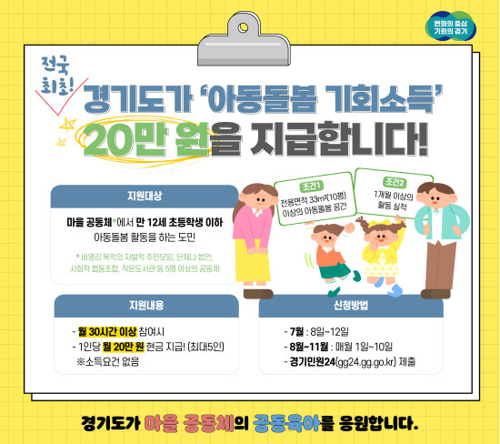 [프레스뉴스] 장현준 기자= 경기도가 마을 주민모임 등 아동돌봄공동체에서 돌봄 활동에 참여하는 도민에게 1인당 월 20만 원을 지급하는 ‘아동돌봄 기회소득’ 참여자를 7월 8일부터 모집한다.