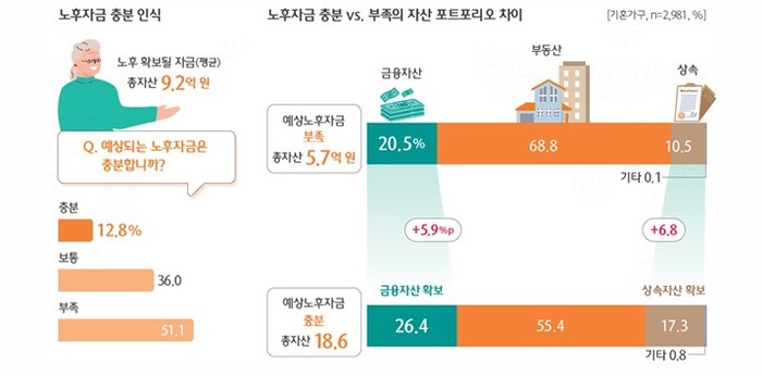 기혼 10가구 중 9가구는 노후 준비가 부족하거나 준비를 못했다고 응답했다. 기혼 가구의 평균 총자산은 약 7억 원이고 은퇴 시점까지 2억 원 이상을 더 축적할 것으로 예상했지만 노후 불안은 여전히 높았다. 한편 노후자금이 충분하다고 인식한 나머지 한 가구의 총자산은 18.6억 원으로 평균의 2배였고, 금융자산과 상속자산의 비중이 평균보다 높았다.