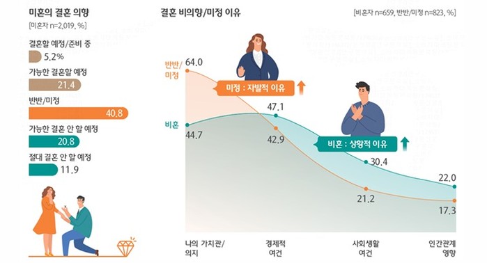 ▲미혼의 결혼 의향, 결혼 비의향/미정 이유 그래픽(사진=하나금융연구소) |