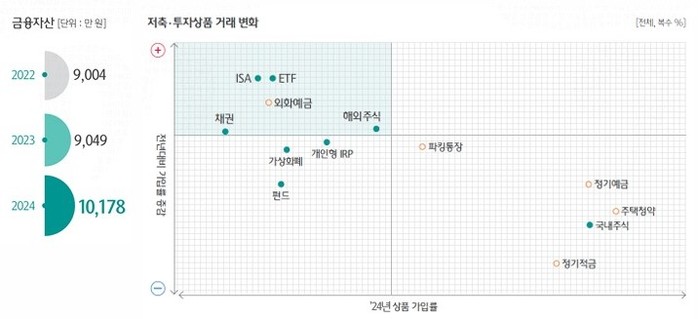 코로나19 시기인 2022년 저축성 자산은 금융자산의 42%를 차지했고 다음 해 금리 상승과 함께 45%까지 높아졌다. 당시 평균 금융자산은 9천만 원에서 정체됐지만 엔데믹 후 2024년 금융자산은 1억 원을 넘었고 투자상품 비중은 25%(2022년)에서 31%까지 늘었다.