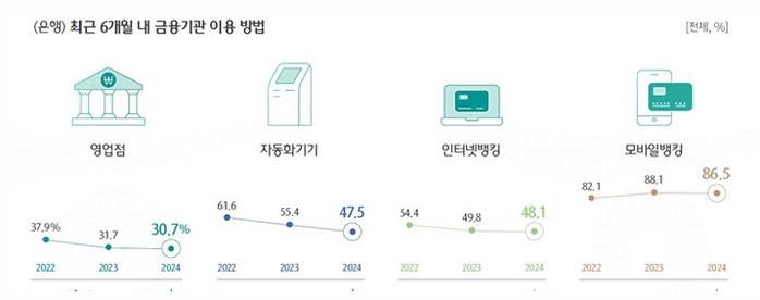 금융거래 시 10명 중 9명은 모바일 채널을 이용한 반면, 영업점 이용률은 최근 3년간 지속 감소하며 31%에 그쳤다. 자동화기기 이용률 또한 2022년(62%)부터 2024년(48%)까지 지속 감소했다. 디지털기술 발전에 따라 영업점이 필요하다는 응답(28%)보다 디지털 채널로 대체 가능하다는 응답(34%)이 우세하지만 금융거래 시 겪는 애로사항을 보면 ‘점포‧직원 수 감소로 인한 불편’이 2022년 6위에서 2024년 3위로 급상승했다. 또한 영업점 이용자 중 1/3은 월 1회 이상 점포를 자주 방문하는데, 해당 비율은 늘고 가끔 방문(6개월에 1~2회)하는 비율은 감소하는 경향을 보였다.